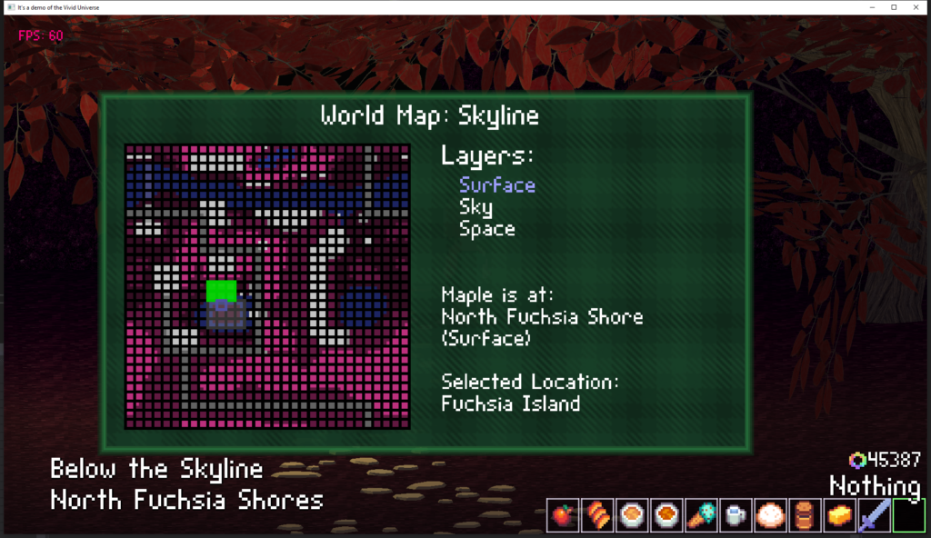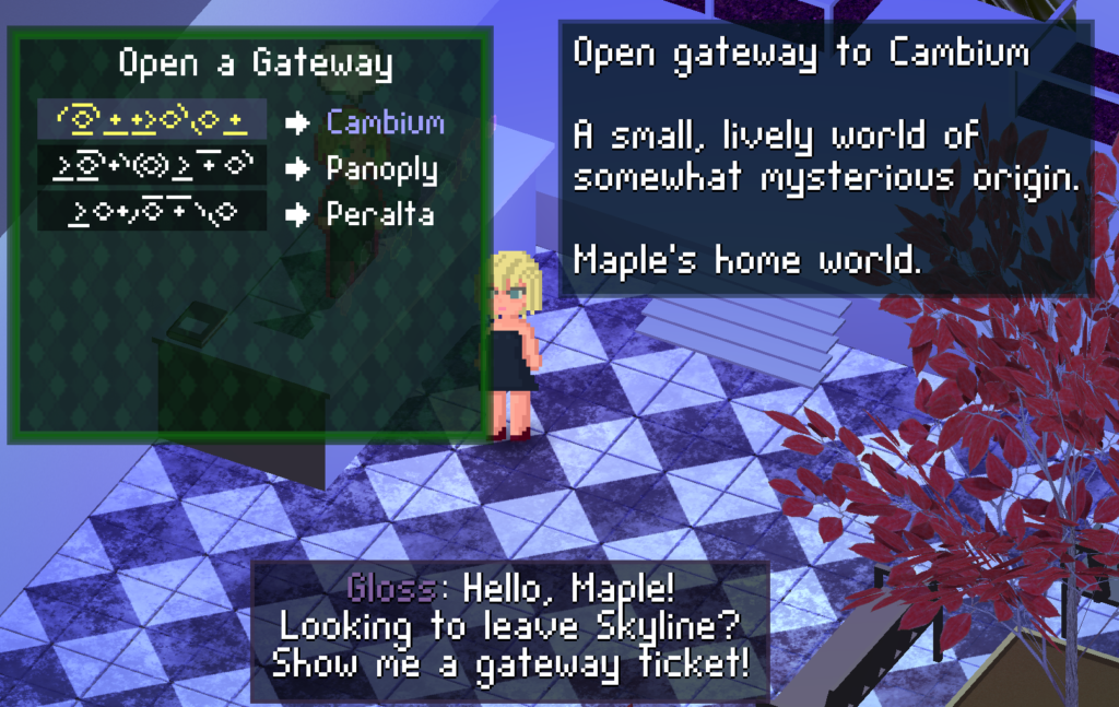 First take on a world map display, that shows where Maple currently is, and allows you to browse around at the rest of the world. Multiple world layers (like Skyline’s surface, sky, and space) are individually selectable.