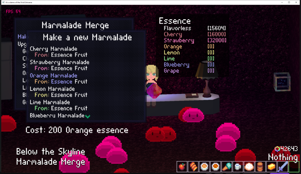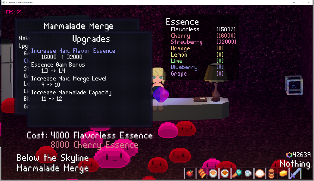 The slimes have been named Marmalade and come in different flavors. You can grow them here and harvest their flavor essence. Come back occasionally and buy them some upgrades until you can afford to exchange for some weapons, items, continuum fragments, and other fun things.
